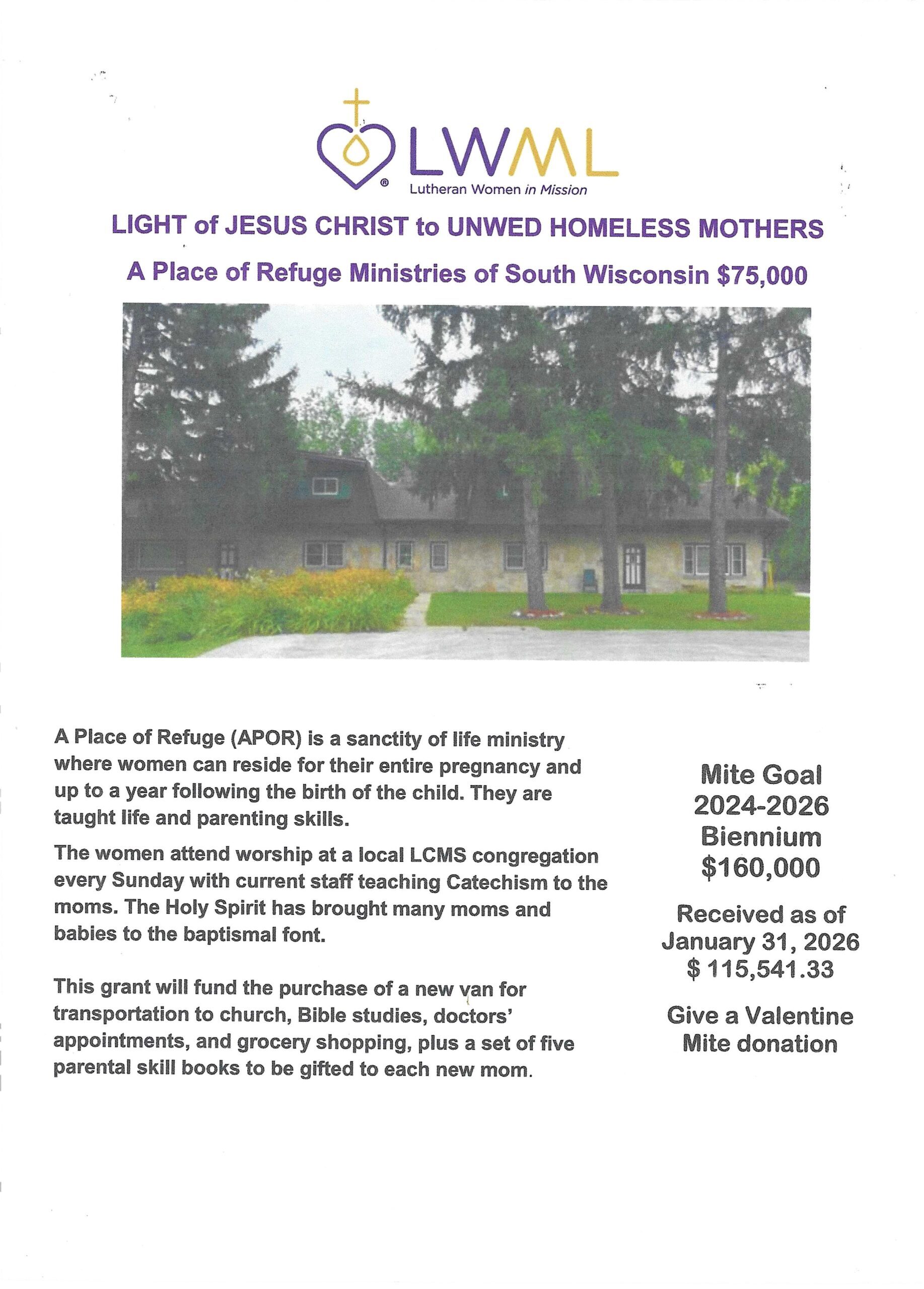 A Place of Refuge Ministries of South Wisconsin $75,000 A Place of Refuge (APOR) is a sanctity of life ministry where women can reside for their entire pregnancy and up to a year following the birth of the child. They are taught life and parenting skills. The women attend worship at a local LCMS congregation … Read more