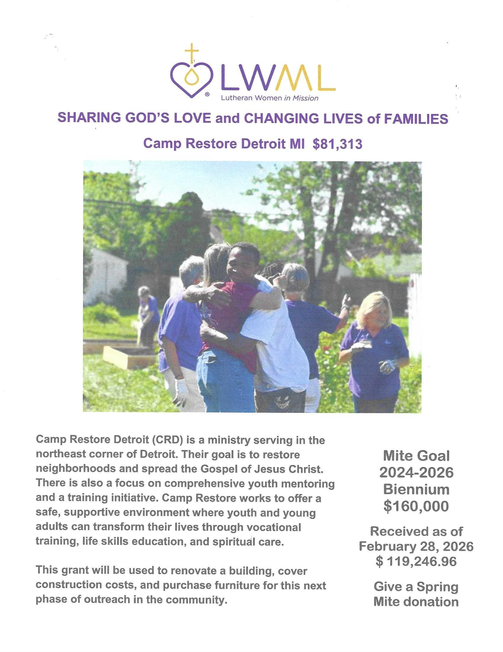 Camp Restore Detroit MI $81,313 Camp Restore Detroit (CRD) is a ministry serving in the northeast corner of Detroit. Their goal is to restore neighborhoods and spread the Gospel of Jesus Christ. There is also a focus on comprehensive youth mentoring and a training initiative. Camp Restore works to offer a safe, supportive environment where … Read more